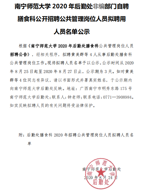 英国上市官网3652020年后勤处非编部门自聘膳食科公开招聘公共管理岗位人员拟聘用人员名单公示