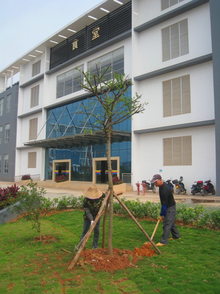 由我院后勤处引进的粉花山扁豆,种植在五合校区饭堂门口左右各一棵。树苗高3.5米,树围约23厘米。为了这两棵名贵树种来到"新家",后勤处工作人员积极与南宁市绿美园林园林工程有限责任公司 的工程师一起,想方设法,不远千里,从广东揭阳引进,一路小心呵护,终于让"他们"在五合新校区安了家,让五合的绿化队伍添加一个可爱的新成员。据专家介绍,粉红山扁豆属于国家一级保护植物,由专业的绿化工程师精心培育,目前能在南宁市看到已经开花的粉红山扁豆仅有三棵,分别分布在广西大学及广西医科大学院内。引进的这两棵树苗将于两年后开花,盛开粉红色花朵,覆盖整个冠幅,艳丽悦目,看起来非常柔和可爱;冬春季挂果累累,形如腊肠,婆娑多姿,令人陶醉,是南方观赏价值很高的乔木花卉。