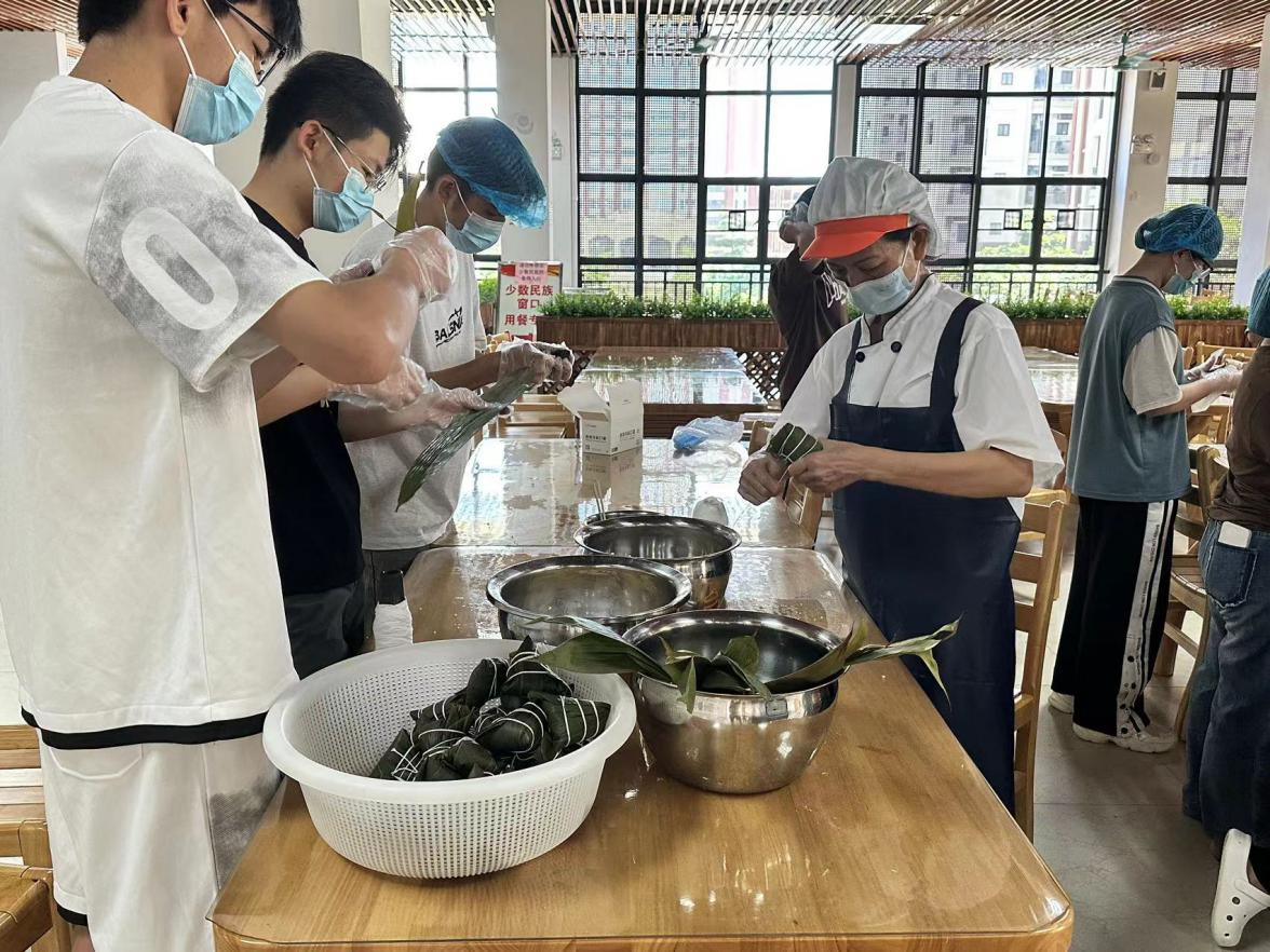 为了让师生们在即将到来的端午节吃到“民俗传承”的味道,武鸣桂园食堂及五合大伙食堂提前备足粽叶、糯米、五花肉等包粽子所需食材。活动现场,食堂师傅在一旁亲自操作示范包粽子技能,同学们认真观摩聆听后,纷纷动手实践,捏糯米、折粽叶、捆粽子……大家一边沉浸在包粽子的乐趣中,一边交流着技巧与心得。经过同学们的精心制作以及食堂师傅们熬煮,饱满紧实的粽子出锅了。